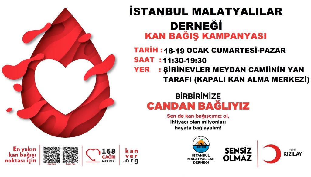 İstanbul Malatyalılar Derneği, Türk Kızılay iş birliğiyle anlamlı bir sosyal sorumluluk projesine imza atarak kan bağış kampanyası düzenliyor. 18-19 Ocak tarihlerinde gerçekleşecek olan kampanya, Şirinevler Meydan Camii’nin yanındaki kapalı kan alma merkezinde, saat 11.30-19.30 arasında gerçekleştirilecek.