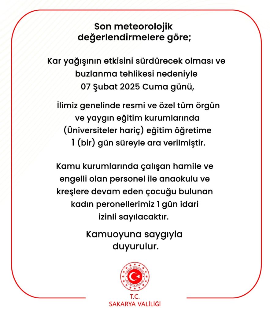 KAR NEDENİYLE 7 ŞUBAT 2025 CUMA GÜNÜ OKULLAR TATİL!…