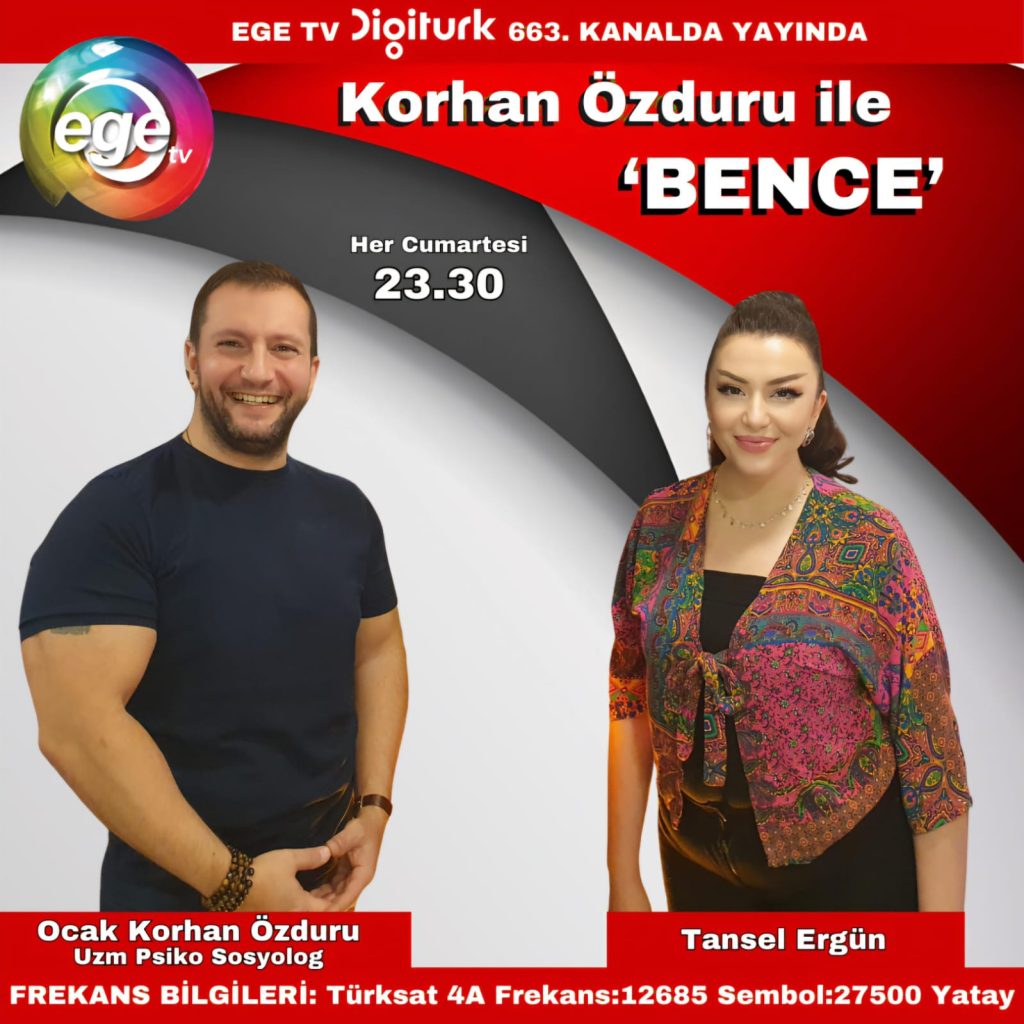 Her Cumartesi saat 23.30’da Ege TV ekranlarında yayınlanan Korhan Özduru ile “Bence” Programı, izleyicilere psikoloji ve insan davranışları üzerine derinlemesine sohbetler sunuyor. Programda, Uzman Psiko Sosyolog Ocak Korhan Özduru ve moderatör Tansel Ergün, geniş bir yelpazede önemli konuları ele alıyor.