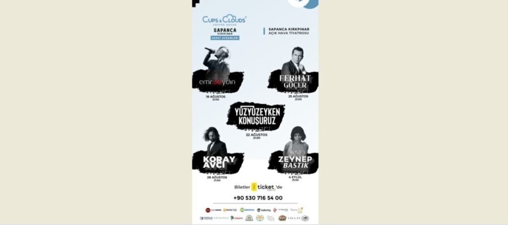 Etkinlik serisi, 18 Ağustos’ta rock müziğin sevilen ismi Emre Aydın’ın sahnesiyle start alacak. Gençlerin son dönemde favori grubu haline gelen Yüzyüzeyken Konuşuruz, 22 Ağustos’ta sahnede olacak. Sapanca Kırkpınar Sanat Akşamları’nın vazgeçilmez ismi, tam 15 yıldır bu etkinliğin bir parçası olan Ferhat Göçer, 25 Ağustos’ta hayranlarıyla buluşacak. Arabesk müziğin güçlü temsilcisi Koray Avcı ise 28 Ağustos’ta sahne alacak. Son olarak, son dönemin en çok konuşulan sanatçılarından Zeynep Bastık, 4 Eylül’de sanatseverlere unutulmaz bir gece yaşatacak.